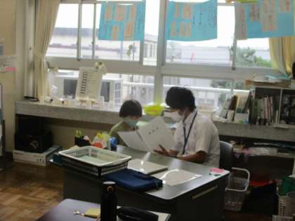 担任の先生から「あゆみ」が手渡されました。1学期の頑張りについてお話を聞いていました。
