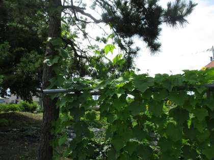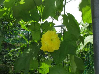 今年も畑のヘチマが隣の松の木まで到達しました。