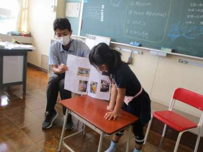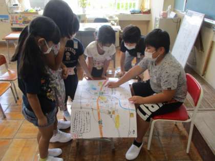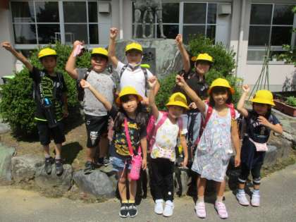 やる気いっぱいの子供たち。夏休みの作品紹介を行いました。友達の内容に興味をもって聞くことができましたね。最後は玄関前でみんなでポーズ!「2学期もがんばるぞ〜!」