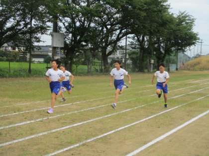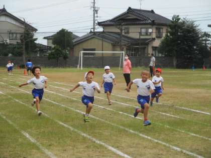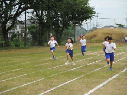 登校直後、子供たちが元気にグランドにやってきました。スタートダッシュがきまっています。