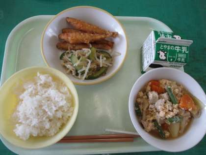 今日のメニューは、ご飯、わかさぎのフリッター、甘酢和え、高野豆腐の卵とじ、牛乳でした。さくさくのフリッターやふわふわの卵とじ等、今日もおいしくいただくことができました。