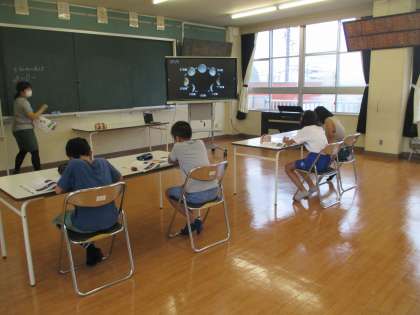 「月の形と太陽」の単元で、「月の形が、日によって変わって見えるのはどうしてだろうか」について学習をしました。考えを互いに発表し合い、ボールを使って確かめる実験をしました。太陽と月、地球の位置関係がポイントだということに気付きました。