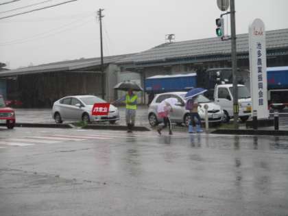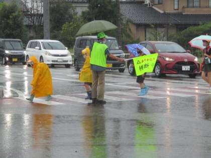 大雨の中、地域の方々が子供たちの登校を見守ってくださいました。おかげさまで、子供たちは安全に気を付けながら登校することができました。ありがとうございました。