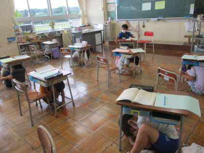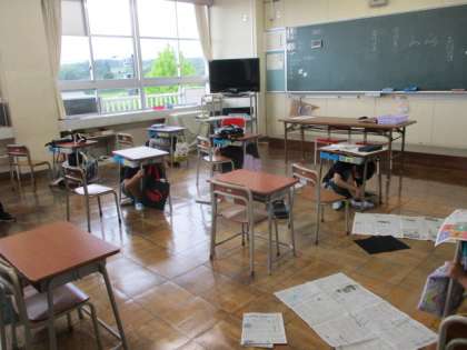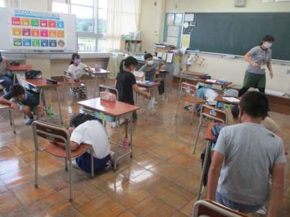 今日は、「防災の日」です。「県民一斉防災訓練シェイクアウトとやま」に合わせ、池多小でも避難訓練を行いました。地震音が響いたと同時に、子供たちは素早く頭を守ろうと行動しました。