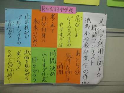 校内には、池多小学校を卒業した先輩方の標語が掲示されています。メディアの使い方について、ハッとさせられますね。