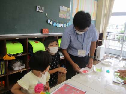 先生を誘って、寒天で遊んでいます。一緒に遊べてとても嬉しそうでした。作ったものを先生にプレゼントしました。