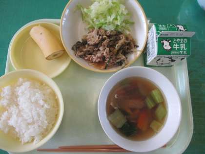 今日のメニューは、ご飯、豚肉のキムチ炒め、ゆでキャベツ、茎わかめスープ、バナナでした。中華風の味付けが今日の気候にぴったりで、おいしくいただきました。