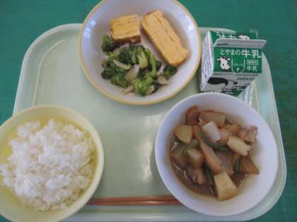 今日のメニューは、ご飯、厚焼きたまご、ブロッコリーとエリンギのソテー、大根と鶏肉の煮込み、牛乳でした。明日から、ランチルームでの給食が再開します。全校みんなでおいしく給食を食べます。
