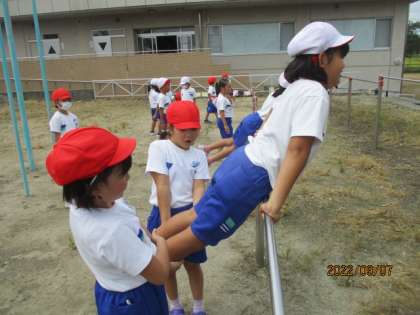 相手の動きをよく見ながらわたりおにをしました。鉄棒あそびでは、つばめや足ぬき回りにチャレンジしました。