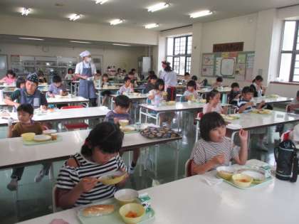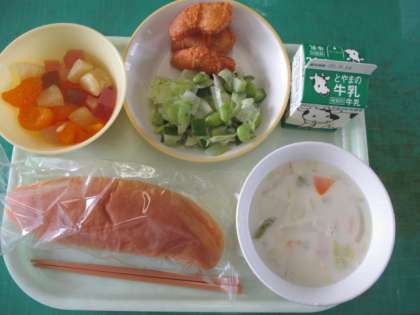 今日のメニューは、コッペパン、チキンナゲット、えごまドレッシングサラダ、白インゲン豆のクリームスープ、フルーツカクテル、牛乳でした。とてもやさしい味で、子供たちも大好きなメニューだったと思います。今日からランチルームでの給食も再開しました。子供たちもうれしそうでした。