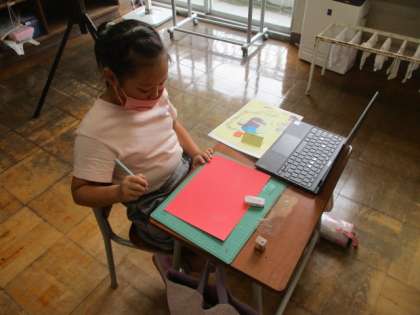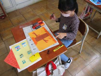 カッターナイフを使って工作をしています。できたまどから何が見えるかな?完成が楽しみですね。