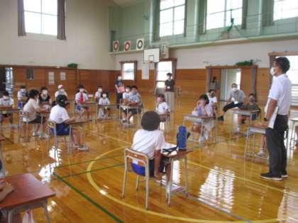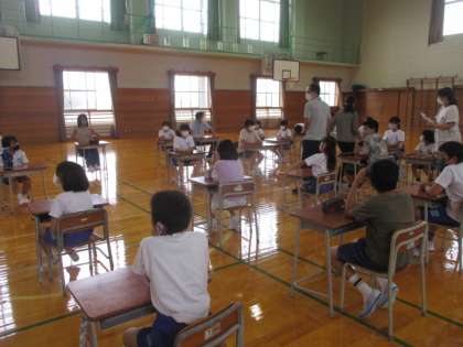 中、高学年が、体育館に集合しました。総合的な学習の時間はこのスタイルで行います。