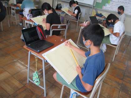 「わたしたちの大切な風景」では、クロムブックで撮ってきた写真を見ながら、画用紙に下書きをしています。遠近感を意識しながら、ものの形をとらえて丁寧に描いていた子供たちです。