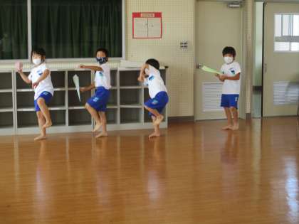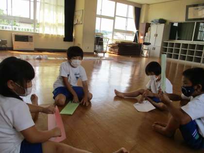 みんなで飛行機を作りました。自分の作った飛行機を友達と教え合っています。よく飛んだ飛行機は、お世話になっている先生方にプレゼントしたいと先生の分も作っていました。