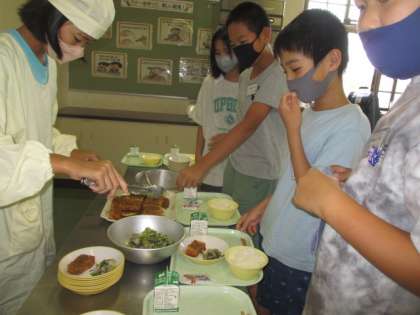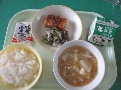 今日のメニューは、ご飯、揚出し豆腐のごまだれかけ、ゆかり和え、豚汁、味付け小魚、牛乳でした。豆腐はふわふわ、ごまだれの味付けともぴったりでした。