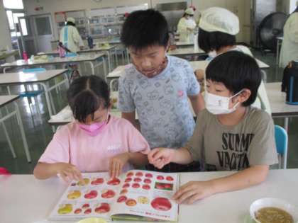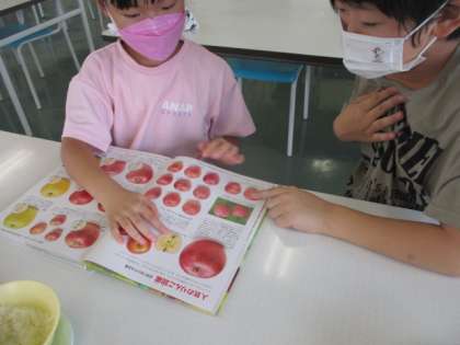 給食の配膳の間、りんごの品種について調べています。たくさんありすぎて、驚きました。