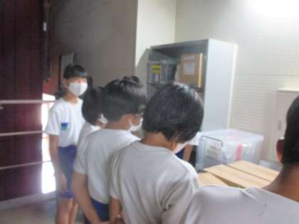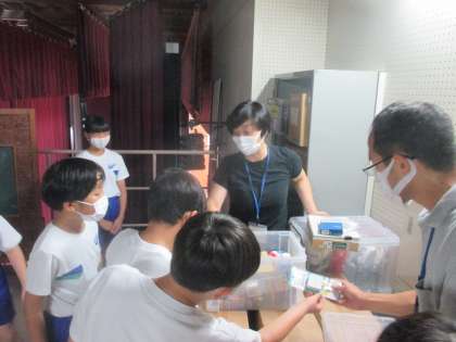 4年生は、社会科で防災について学んでいます。今日は、体育館の舞台裏のスペースに、池多小が避難場所になった場合に使われる品々がたくさんあるのを見せてもらいました。