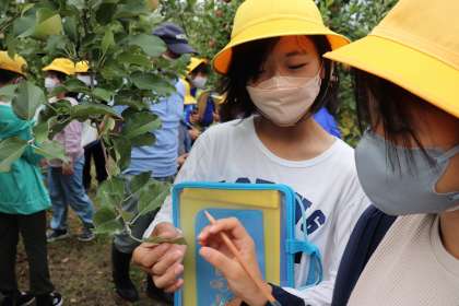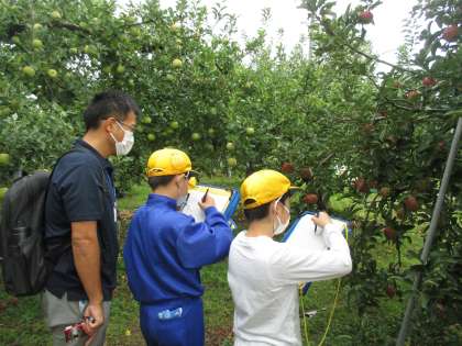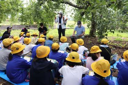 今日は、池多りんご広め隊として、リンゴ畑を見学に行きました。リンゴ畑を自由に観察をした後、りんごの木の下でりんご農家の方にたくさんの質問をして教えていただきました。