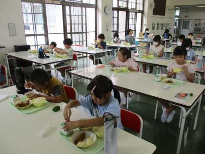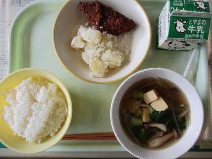今日のメニューは、ごはん、牛乳、魚の利休揚げ、グリーンポテト、豆腐のスープでした。豆腐スープは、スープにきのこなどの野菜の味がしみ出てとても美味しかったです。池多っ子は、今日ももりもり食べています。