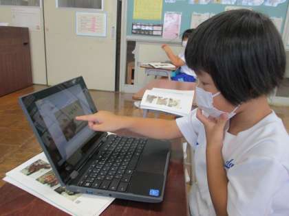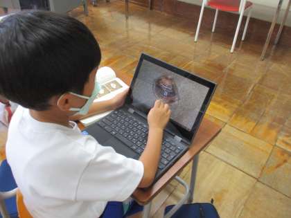 「海のかくれんぼ」のお話を読んでいます。クロムブックではまぐりの隠れる様子を見ています。「消えた!」「ここにいるんだよ!」と驚いていました。