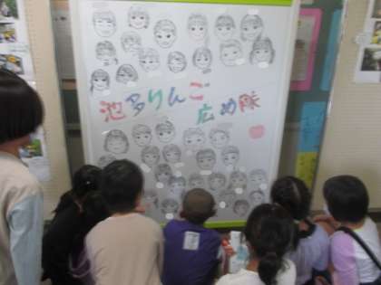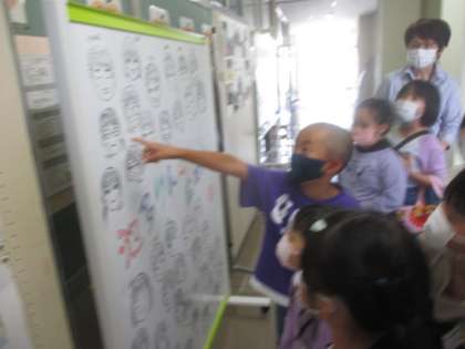 ホワイトボードに描かれた子供たちのイラスト。今日、新たに1、2年生も加わりました。見付けて、大喜びしています。