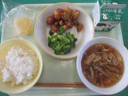 今日のメニューは、ご飯、さかなとひよこ豆の甘からめ、ゆでブロッコリー、沢煮椀、冷凍りんごでした。温かい汁物がうれしくなってきました。