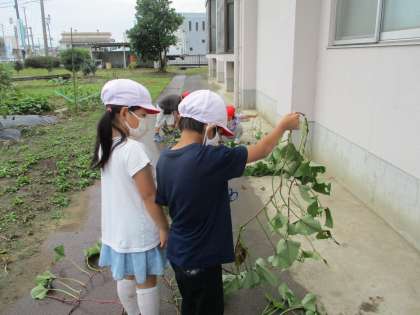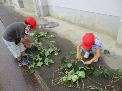 生活科の時間にサツマイモのつるで、リース作りをします。今日はみんなでつるを採って、リース作りの準備をしました。