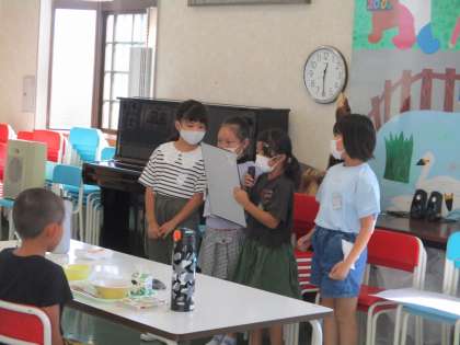 1・2年生は自分たちが収穫したサツマイモを他の学年にも配りたいと考え、給食の時間にお知らせをしました。月曜日に各家庭に渡るように準備をします。