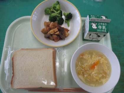 今日のメニューは、食パン、鶏肉とレバーのマーマレードソースからめ、ゆでブロッコリー、コーンと卵のスープ、牛乳でした。ひんやりとした空気の中、温かいスープはうれしいです。