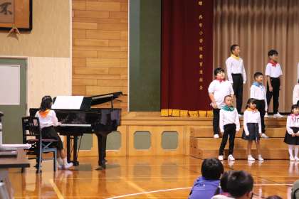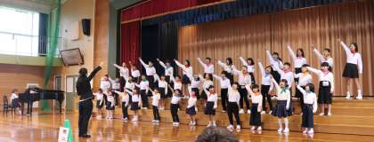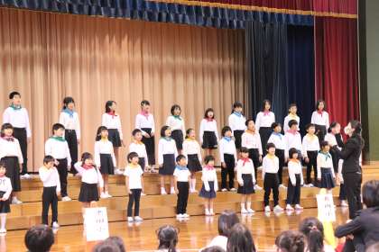 池多っ子が、心を一つにして「レッツゴー!明日へ」と「世界が一つになるまで」を歌いました。素敵な歌声が体育館に響きました。