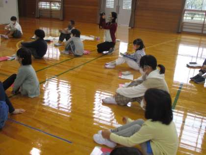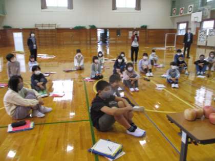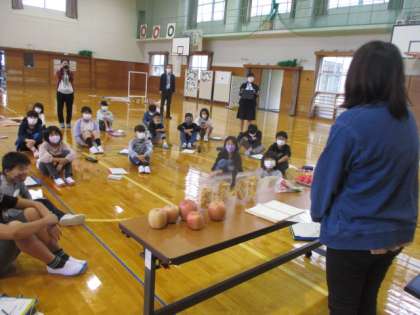 体育館でも詳しくお話を聞きました。子供たちは、ますますりんごへの思いを深めています。
