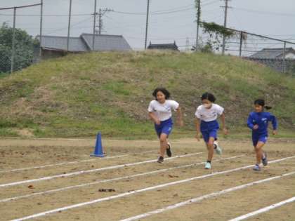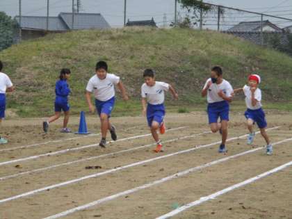 曇り空ですが、子供たちはにこにこと友達と一緒にダッシュしています。