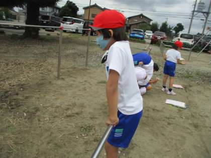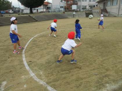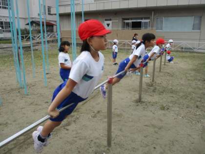 ボールあそびでは、円の外からボールで当てるゲームをしました。子供たちは当てられないように懸命に逃げていました。鉄棒あそびでは、自分でチャレンジしたい技の練習を行いました。