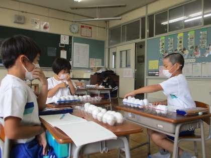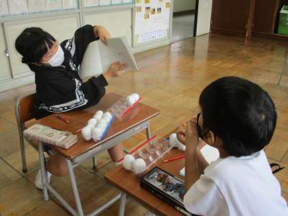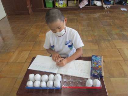 たまごを使って足し算の仕方を考えています。簡単に答えを出すためにはどうしたらよいか友達と一緒に考えていました。