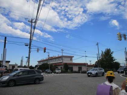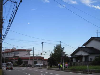 月と広がった雲がきれいな朝です。子供たちは元気に登校しています。