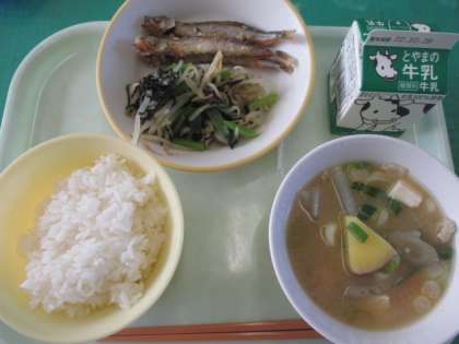 今日のメニューは、ご飯、ししゃもの唐揚げ、磯和え、さつま汁、牛乳でした。それぞれに歯ごたえがあり、よく噛むとおいしさが広がります。