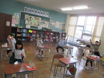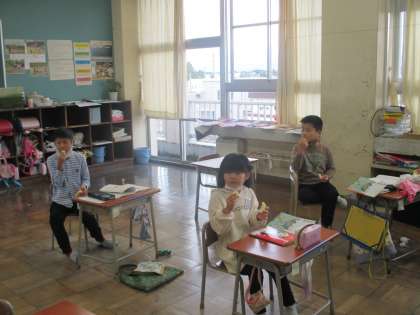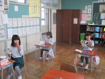 6時間目にりんごを食べました。このりんごは、「王林」という品種で、1,2年生が地元のりんご畑に見学に行ったときにいただいたものだそうです。「甘い!」「おいしい!」「はちみつみたい!」「ジューシーだ!」などの声。これまで食べたりんごの味と比べながら、じっくりと味わって食べていた子供たちでした。