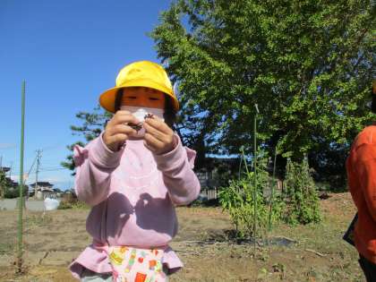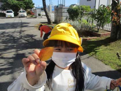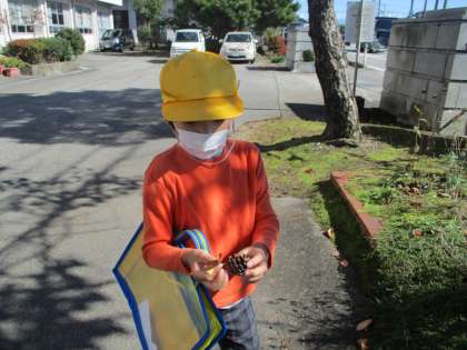 外で秋見付けをしました。色がグラデーションになっている葉や小さな松ぼっくり等をたくさん見付けました。