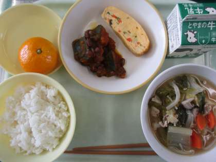 今日のメニューは、ご飯、牛乳、千草焼き、かぼちゃのいとこ煮、はくさいなべ、みかんでした。かぼちゃがとっても甘かったです。秋の甘みです。