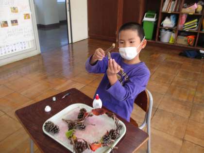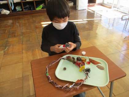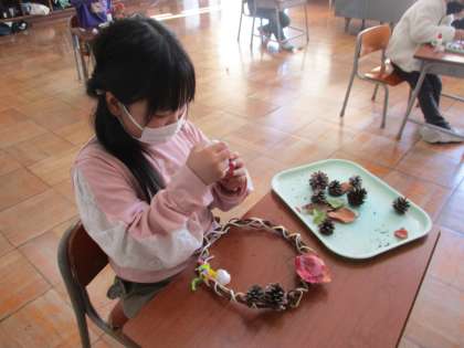 秋のリースがあと少しで完成です。今日は、学校の周りで見付けた松ぼっくりや落ち葉を飾り付けしました。