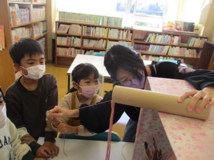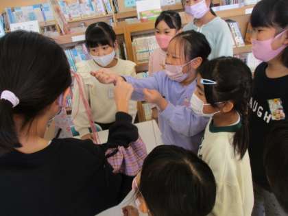 情報委員会の上学年のみなさんが図書室に招待してくれました。「一番くじ」をして、当たった本を読ませてもらいました。