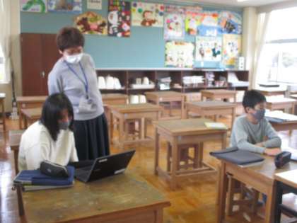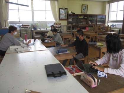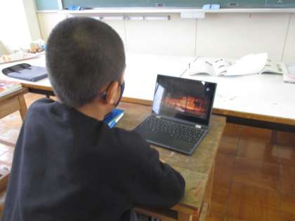 古典芸能の世界について学んでいます。子供たちは、能楽とは何かをクロムブックの動画を視聴し、つかみとろうとしていました。