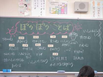 2年生の教室でも、子供たちからたくさんの「ぽかぽか言葉」が出されました。温かい言葉で黒板がいっぱいになっています。