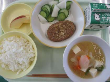 今日のメニューは、ご飯、和風煮込みハンバーグ、きざみ和え、豆腐の味噌汁、りんご、牛乳でした。ハンバーグにかけた白ごまが肉の甘みをひき立てていました。