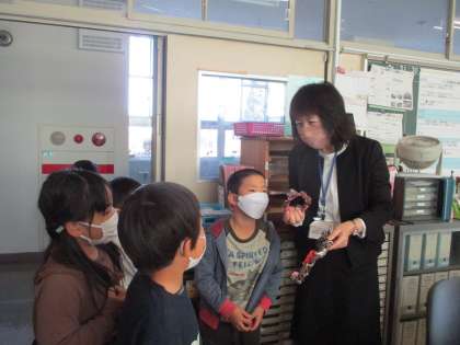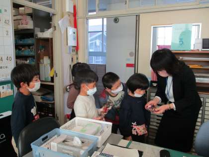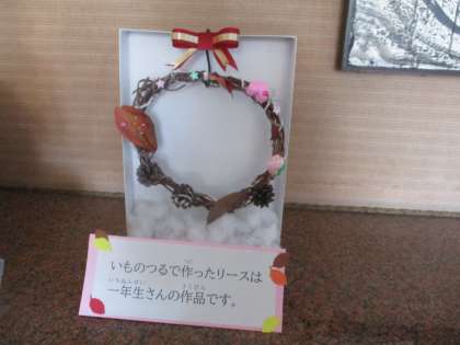 生活科で作ったリースを職員室の先生方にプレゼントしました。先生方が喜んでくださって、子供たちもとても満足そうでした。
