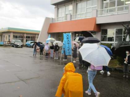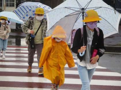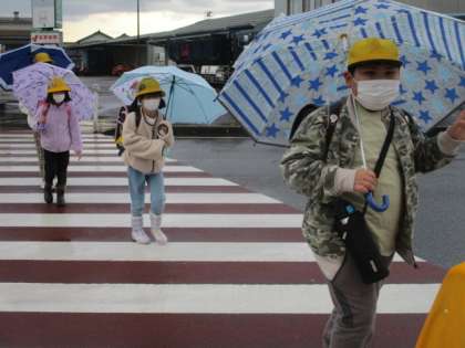 安全に傘をさして歩きます。学校はすぐそこです。
