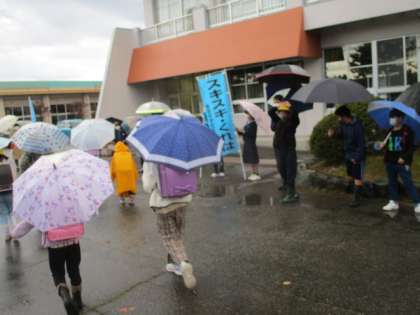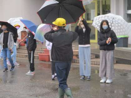 雨の中ですが、卒業生とともに挨拶運動を行いました。前庭がとてもにぎやかになりました。