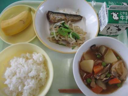 今日のメニューは、ご飯、鰯の土佐煮、もやしのおひたし、豚肉の南蛮煮、バナナ、牛乳でした。野菜のシャキシャキ感が残り、とてもおいしく食べました。