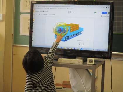 トラックの仕事とつくりについて考えています。自分の考えをクロムブックを見せながら友達に伝えています。