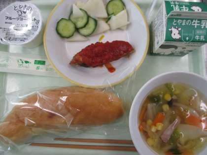 今日の給食は、米粉コッペパン、牛乳、しいらのイタリアンエゴマソースかけ、かぶのゆずサラダ、はくさいスープ、ラフランスヨーグルトでした。イタリアンソースの甘酸っぱさが、魚のフライにぴったりでした。